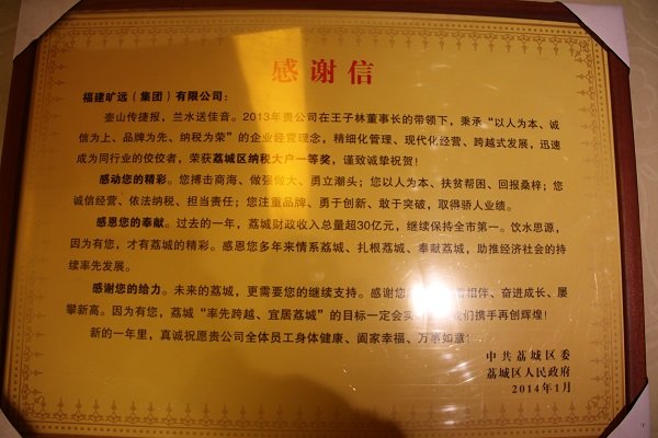 旷远能源荣获2013年度莆田市荔城区“纳税大户一等奖”