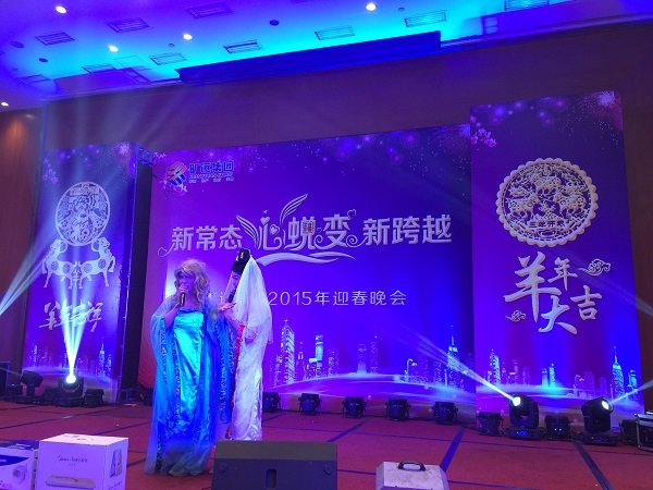 图为旷远集团2015年迎春晚会现场高管变装登台拜年